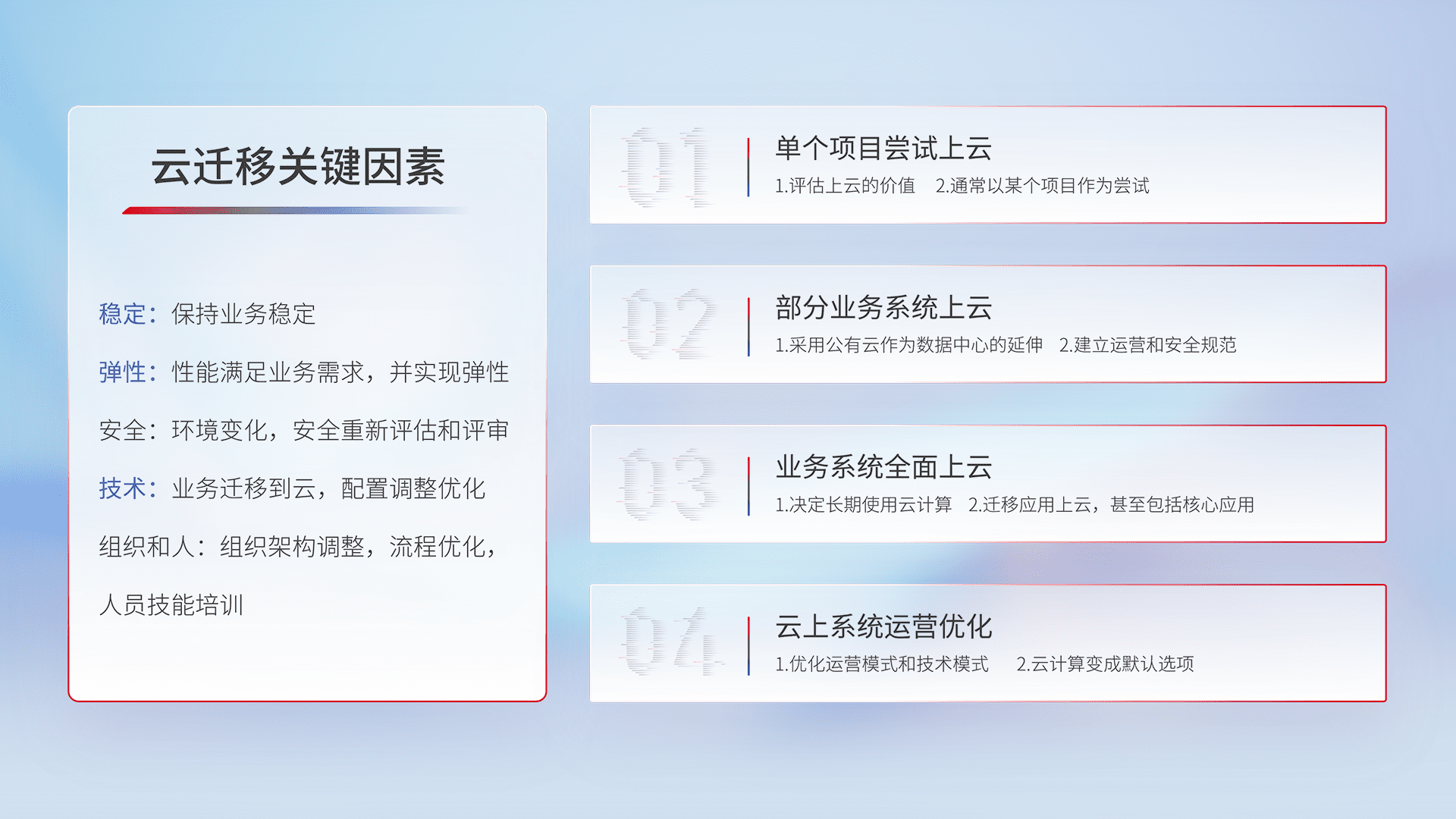 结合实际业务,,从规划设计、、云平台选型、、、云原生改造、、、数据迁移、、集成交付,,,,迁移全过程为客户识别最佳上云路径,,做好风险识别管理,,,设计网络架构、、、身份权限、、安全审计合规、、操作审计、、、、日志审计、、监控告警策略、、、、多站点容灾设计等,,,对云上基础设施进行整体规划,,提升IT治理水平,,,以满足弹性、、、高可用、、、、高性能的需求。。。