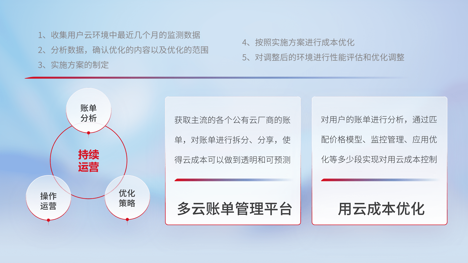 通过多云纳管,,以统一的资源数据模型把客户的云资源进行抽象和封装,,,进而实现对多云资源的统一操作,,,保障云资源管理的可靠性、、稳定性与可用性。。。。量身定制化运维内容,,配置、、、、开发运维、、、补丁管理、、备份、、、监控、、认证和访问管理、、审计和日常巡检等,,,,保障在用云过程中的可靠度,,稳定度以及高可用率。。。